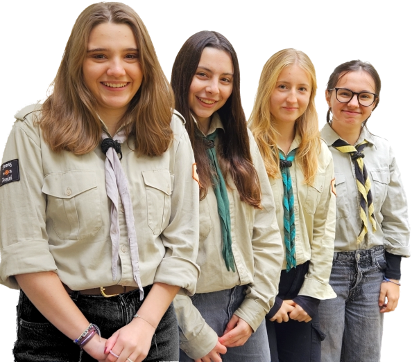 Die Taunus-Pfadfinder tragen eine khakifarbene Tracht, schwarze Hose und ein der Stufe entsprechendes Halstuch.
